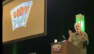 In October 2019, de Lancie was a featured speaker at the annual conference of the Center for Inquiry, CSICon.[34][39] At the conference he announced two new projects.[40] The first, an animated series, titled God's Goofs, is meant to point out that intelligent design is absurd. The second project is a play based on the historic 2005 intelligent design trial in Dover, Pennsylvania, the first direct challenge brought in the United States federal courts testing a public school district policy that required the teaching of intelligent design.[41]