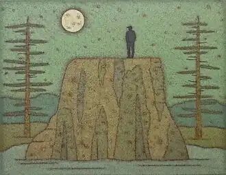 By 2006, Dilg committed to a spare landscape mode that New York Times critic Roberta Smith later termed "cartoon-visionary."[16][7][40] In these small-scale paintings, he engages his subject less as historically specific sites than as stylized, general signs that metaphorically record and convey his relationship with the land.[16][7][2] They bring together diverse sources and precedents in a singular, personal vision—among them, 19th-century chromolithography, Japanese woodcuts, Early Renaissance landscapes, self-taught art, vintage postcards and game boards, thrift-store paint-by-number paintings and handmade signs.[1][7][41][42] Dilg's interest in tourist and folk-art sources stems from a desire to recover the immediacy, sense of wonder and discovery, and uncanniness of such imagery—qualities often trained out of professional artists.[8][36] His carefully selected and composed pictorial elements often tap into the power of primal subjects: waterfalls and gorges (e.g., On Another Planet, 2012), towering sequoia forests and evergreens, and formations like Yosemite's Half Dome that evoke the American West of 19th-century artists like Albert Bierstadt and Thomas Moran, as well as the Gothic, moonlit landscapes of German Romantics, such as Caspar David Friedrich.[8][43][42][44]