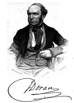 John Doran (11 March 1807 – 25 January 1878) was an English editor and miscellaneous writer of Irish parentage, wrote a number of works dealing with the lighter phases of manners, antiquities, and social history, often bearing punning titles, e.g., Table Traits with Something on Them (1854), and Knights and their Days. He edited Horace Walpole's Journal of the Reign of George III.. Among other posts, Doran was for a short time editor of The Athenaeum.