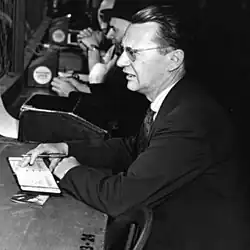 John Drebinger (March 23, 1891 – October 22, 1979), nicknamed "Drebby", was an American sportswriter in New York City for over 50 years. Between 1929 and 1963, he wrote the lead story in The New York Times for every World Series contest, a total of 203 games.[1]