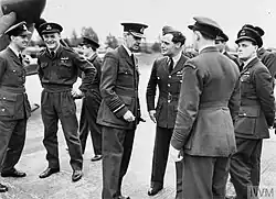 On release from captivity, Ellis returned to the United Kingdom and participated in an anniversary flight over London on 15 September 1945 to commemorate the Battle of Britain.[6] He remained in the RAF in the postwar period, given a permanent commission as a squadron leader with effect from 2 September 1945.[19] He held an appointment as a wing commander with responsibility for training at the headquarters of Fighter Command.[6] Promoted to wing commander at the start of 1951,[20] he was subsequently in charge of the RAF station at Molesworth. He later attended RAF Staff College and the majority of his later career in the RAF was spent in administrative roles.[2][6] He was appointed as an officer in the Order of the British Empire in the 1956 Birthday Honours[21] and three years later was promoted to group captain, taking up a posting as Senior Personnel Staff Officer at Fighter Command.[6][22] In the 1960 Queen's Birthday Honours, his appointment in the Order of the British Empire was elevated to commander.[23]