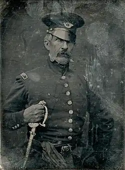 Hamtramck then became a farmer and for several years served as an indian agent to the Osage before settling down as a farmer again, this time in Jefferson County, Virginia. There he also was active in the militia, becoming a Captain, and in the Whig Party.[1] After the Mexican-American War had begun he volunteered for service and was named Colonel of the 1st Virginia Infantry Regiment in December 1846.[5] The United States Volunteers unit had 14 companies, including one of Grenadiers and one of Light Infantry, and was raised for the duration of the war. It's officer corps included prominent people like Major Jubal Early, Captains Kenton Harper and Montgomery D. Corse and Lieutenant David A. Weisiger.[6] The regiment served in northern Mexico and saw little action, Hamtramck became military governor of Saltillo in early 1848. Quartermaster James L. Kemper described the Colonel as "a great stickler for the minutiae of military regulations and equipments" but added that these qualities were a necessity for the situation. The unit stayed in place till June 1848, and then was disbanded.[1]