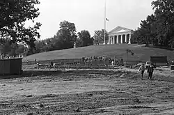 The initial suggestion to bury Kennedy at Arlington appears to have been made by Secretary of Defense Robert McNamara.[10][11] First Lady Jacqueline Kennedy agreed to the change.[10] Although Kennedy's sisters and many of his longtime associates from Massachusetts were opposed to burial at Arlington, his brother, Attorney General Robert F. Kennedy visited the site with McNamara on Saturday, November 23, and concluded that Jacqueline Kennedy's wishes should be honored.[10][11]