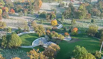 Initial press reports indicated that Kennedy would be buried at Holyhood Cemetery in Brookline, Massachusetts, where his son Patrick Bouvier Kennedy (who had died on August 9, 1963, two days after his premature birth) was buried.[5] But the site for Kennedy's grave was quickly changed to the hillside just below Arlington House in Arlington National Cemetery; some months earlier Kennedy had admired the location's peaceful atmosphere while visiting it with his friend, architect John Carl Warnecke.[6][7][8][9]