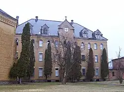 The school is built on land originally acquired by Fr. Ambrose Oschwald in 1854. Oschwald, the founder of a secular institute, wanted to create a village whose members would observe the evangelical counsels of poverty, chastity and obedience according to their states of life. The entire congregation relocated to America that year as Oschwald believed "it was impossible to build up in the native Black Forest in Baden, Germany a Catholic village and/or parish which would be essentially geared to the pursuit of Christian perfection through the obersvation (sic) of the evangelical counsels by all its members, married, single and celibate (cloistered), it was decided to go to America and stamp this enterprise out of the virgin soil of a newly opened up territory..."[3]
