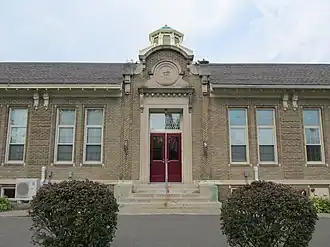 The former John Fitch School stands west of Windsor's village center, on the north side of Bloomfield Avenue (Connecticut Route 305), between Mack Street and Hayden Avenue. It is a complex of three constructions, consisting of the original main block and two large ells. All are single-story or 1-1/2 story masonry structures, built out of buff brick with stone trim. The main block was originally covered by a distinctive green tile roof; this has been replaced by asphalt architectural shingles. At its center is an octagonal cupola with green dome. The main entrance is set in a recess framed by bracketed hood and topped by a Flemish gable, in which a bas-relief of the school's namesake is set in a medallion. John Fitch was a local militia member who died in King Philip's War.[2]