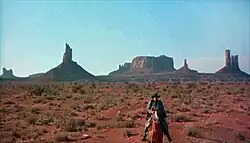 Stagecoach is significant for several reasons—it exploded industry prejudices by becoming both a critical and commercial hit, grossing over US$1 million in its first year (against a budget of just under $400,000), and its success (along with the 1939 Westerns Destry Rides Again with James Stewart and Marlene Dietrich, Cecil B. DeMille's Union Pacific with Joel McCrea, and Michael Curtiz's Dodge City with Errol Flynn), revitalized the moribund genre, showing that Westerns could be "intelligent, artful, great entertainment—and profitable".[39] It was nominated for seven Academy Awards, including Best Picture and Best Director, and won two Oscars, for Best Supporting Actor (Thomas Mitchell) and Best Score. Stagecoach became the first in the series of seven classic Ford Westerns filmed on location in Monument Valley,[40] with additional footage shot at another of Ford's favorite filming locations, the Iverson Movie Ranch in Chatsworth, Calif., where he had filmed much of Wee Willie Winkie two years earlier. Ford skillfully blended Iverson and Monument Valley to create the movie's iconic images of the American West.