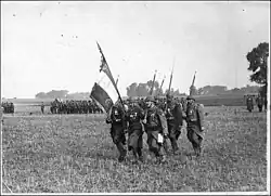 One of Elkington's officers was the future field marshal Bernard Montgomery, who recalled the unit marching in the gap between the forward German cavalry screen and their following infantry.[14][16] In his memoirs Montgomery criticised Elkington's leadership in this period, though he praised his successor Major A. J. Poole.[16][14] Mainwaring and Elkington's battalions reached the British lines but were understrength; the Warwicks were still missing 291 stragglers on 1 September. The battalions were combined into a composite unit until 6 September when sufficient reinforcements and stragglers were gathered to allow the units to stand alone.[17][14]