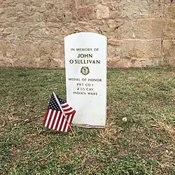 John Francis O'Sullivan was born in County Kerry, southern Ireland in about 1850. He eventually emigrated to the United States where he enlisted in the U.S. Army in New York City, New York on March 22, 1870.[1] O'Sullivan became a member of the 4th U.S. Cavalry and saw action during the Texas-Indian Wars of the 1870s. On December 8, 1874, he was part of a cavalry detachment that was pursuing 10 Indians through the Muchague Valley. In the course of the chase the Indians suddenly dismounted and took up positions to fire upon the soldiers. He and fellow Private Frederick Bergendahl distinguished themselves in this battle, and after nearly all the renegades had been killed, O'Sullivan pursued the last surviving Indian but was unable to catch him. Both Bergendahl and O'Sullivan were received the Medal of Honor, as well as Lieutenant Lewis Warrington, for gallantry at the Staked Plains on October 13, 1875.[2][3][4][5][6][7][8] After leaving the military, O'Sullivan returned to New York where he died on May 19, 1907, at the age of 57.[1] He was buried at Calvary Cemetery in Queens, New York. A memorial marker was erected in his memory at Fort Concho National Historic Landmark in San Angelo, Texas.