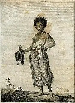 Stedman first mentions Joanna by name in his journal on 11 April 1773 in relation to his negotiation with her mother for the purchasing of Joanna's sexual and domestic services: "J—, her Mother, and Q— mother come to a close bargain with me, we put it of for reasons I gave them."[28][35] Stedman eventually negotiates an arrangement with Joanna's mother, which he indicates in this diary entry: "J—a comes to stay with me. I give her presents to the value of about ten Pound sterling and am perfectly happy."[35] In the 1790 manuscript edition of Stedman's travel narrative, edited and expanded on from his travel diary, he praised the physical appearance of Joanna, "bespeaking the Goodness of her heart".[37]