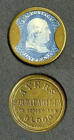 Gault was a savvy business man and saw two ways that he could profit off the implementation of these new “coins.” First, Gault sold his currency to businesses and stores with high demand for coins at 120% the face value of the stamp. He soon realized that the bare back covering of the currency provided space that could be used for advertising. Companies paid Gault a two-cent premium on top of the cost of the stamp in exchange for a customized case to the specifications of the companies advertising desires. One of Gault's largest business partners was J.C. Ayer who took advantage of Gault's advertising space during the preliminary months of the creation of the currency.[2] At minimum thirty companies stamped advertisements on the backing of his brass currency. Gault sold an estimated $50,000 in encased postage stamps.[5]