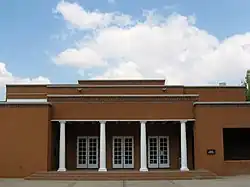 Meem also left a significant mark on the University of New Mexico campus, where his firm designed a total of 25 buildings between 1933 and 1959. He also served as a consultant on two later projects by Holien and Buckley.[9] Two of the university buildings, Scholes Hall and Zimmerman Library, are regarded as some of Meem's most important works, and the library in particular is considered to be a masterpiece of southwestern architecture.[10]