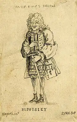 Thomas Davies, in his Life of Garrick (i. 356), described Hippisley as a "comedian of lively humour and droll pleasantry". His appearance was comic, and always elicited laughter and applause from the audience. This was in part due to a burn on his face, received in youth. He says of himself, in his epilogue to The Journey to Bristol, that his "ugly face is a farce".[2]