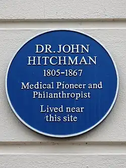 Hitchman was born in Chipping Norton, Oxfordshire, in 1805. He trained as a surgeon's assistant in Banbury before moving to Leamington Priors (renamed Royal Leamington Spa in 1838) in 1827/28. He established a surgeon's practice in Clemens Street and later moved to High Street and then The Parade. For at least 20 years he lived in a house on Lansdowne Place.[1] Hitchman married Sarah Baker of Fenton, Staffordshire, at Stoke on Trent on 26 April 1832.[2] In his surgery Hitchman often prescribed meat from the butcher and remitted his fees for poor patients.[3][4] From 1832 Hitchman was a surgeon at the town's Warwickshire County Hospital, later renamed the Warneford Hospital and Bathing Institution, and was appointed to its board.[5][6]