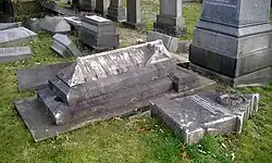 The revival of his role in Olympic history was initiated by an article in the Journal of Olympic History entitled "The Mystery of John Hulley".[60] Subsequently, his grave was rediscovered in 2008; it was badly damaged in that the headstone had been removed from the main covering stones and the grave was in a very bad condition from 130 years of atmospheric pollution.[61][62][63]