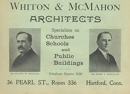 In 1900 McMahon became associate architect of the Hartford, CT firm J. J. Dwyer & J. J. McMahon, with John J. Dwyer. He remained in this position until 1911 when he entered into a long partnership with Frank Warren Whiton, forming the firm of Whiton and McMahon. They continued together until 1932 when the practice was dissolved due to the economic depression. After that McMahon practiced under his own name and briefly with architect Russell Hills.