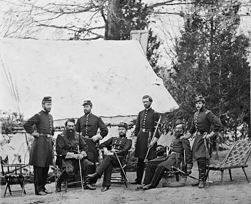 From left to right: Lieutenant Daniel Lodor Jr., Aide de Camp; Major T. Rush Spence, Brigade Surgeon; Captain Green, Brigade Commissary; General John J. Peck; Captain William H. Morris, Assistant Adjutant Surgeon; Captain Silas Titus, Brigade Quarter Master (later Colonel of the 122nd NY Onondaga Regiment); Lieutenant Charles R. Sterling, Aide-de-Camp.