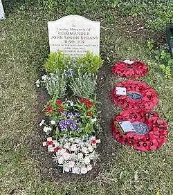 His remains are interred in the churchyard of St Peters, Tandridge and the grave can be found in the eastern side near the boundary wall. The photo left was on the 75th anniversary memorial service 2024 with wreaths laid by The Royal Naval Association Reigate, The Oxted Branch Royal British Legion and Reigate Sea Cadets. A reception was held afterwards at the Oxted Branch Royal British Legion. This commemoration led by the Oxted Branch Chairman Rob Cogan, will be an annual event.[6]