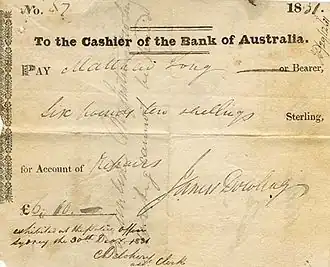 The forged cheque for which Knatchbull was transported to Norfolk Island penal settlement.