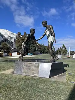 At the 1956 Australian National Championships prior to the Melbourne Olympic Games, in the final of the mile race, Landy stopped and doubled back to check on fellow runner Ron Clarke after another runner clipped Clarke's heel, causing him to fall early in the third lap of the race. Landy, who was close behind, leaped to clear his body but scraped his spikes on Clarke's shoulder. Clarke, the then-junior mile world record holder, had been leading the race. Landy apologised, helped him back to his feet and they both started running again. In the final two laps Landy made up the deficit and won the race.[10] The National Centre for History and Education in Australia said that "[i]t was a spontaneous gesture of sportsmanship and it has never been forgotten."[24] Sculptor Mitch Mitchell created a bronze sculpture of the moment when Landy helps Clarke to his feet. The sculpture was dedicated in June 2002 and is on Olympic Boulevard, Olympic Park in Melbourne.[25]