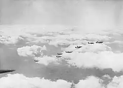 In November, and with the Second World War now underway, Latta was posted to No. 242 Squadron as a pilot officer although under probation.[3][4] His new unit was based at Church Fenton and was composed of Canadian flight crew. Intended to be a fighter squadron, from February 1940 it was equipped with the Hawker Hurricane fighter having initially operated Bristol Blenheim and Fairey Battle light bombers. Its working up period was completed on 23 March at which time it became operational.[5] By this time, Latta was no longer under probation and had been confirmed in his rank of pilot officer.[6]