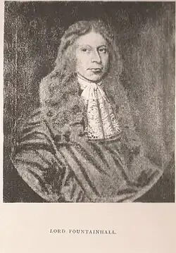 Sir John Lauder of Fountainhall, 2nd Baronet, Lord Fountainhall (baptised 2 August 1646 – 20 September 1722) was one of Scotland's leading jurists who remains an oft-consulted authority. He was knighted in 1680 and matriculated his Arms with the Lyon Court on 15 June 1699.