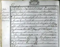 On October 26, 1776, Laurens married Martha Manning in London. Her father, one of Henry Laurens's business agents, was a mentor and family friend whose home Laurens had frequently visited during his years in London.[37] Laurens wrote to an uncle, "Pity has obliged me to marry", an unplanned marriage being necessary to preserve his honor, the reputation of the six-month pregnant Martha, and the legitimacy of their child.[37]