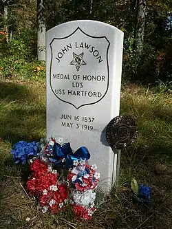 John Lawson was born June 16, 1837. in Philadelphia, Pennsylvania. He enlisted the Navy in New York in December 1863.[1] On August 5, 1864, during the Battle of Mobile Bay, while serving in a member of USS Hartford's berth deck ammunition party, he was seriously wounded after a shell had wounded him in the leg and killed or wounded the rest of his crew. Despite his wounds, he remained at his post and continued to supply the Hartford 's guns. John Lawson was one of twelve men who received the Medal of Honor for heroism that day.