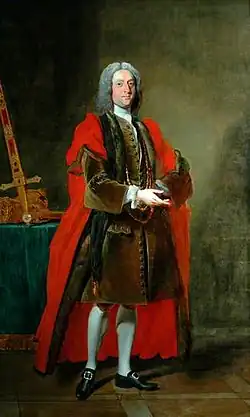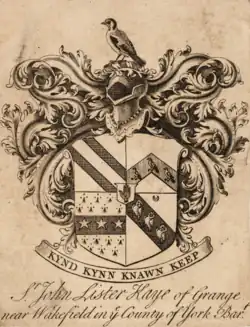 John Lister-Kaye was born at Denby Grange between Wakefield and Huddersfield in the West Riding of Yorkshire. The illegitimate son of Sir John Lister-Kay, 5th Baronet of Denby Grange, he was the sole heir to both the Lister and Kaye families, ancient Yorkshire pedigrees stretching back to the Middle Ages. One son of Kaye married into the Tory Squires family, Danby knights of Masham. On 4 February 1641, Sir John of Woodsome rode out in support of King Charles I and was created a baronet for his services to the Royalist army. He died unmarried in 1789, leaving his estates to his natural son, while the title devolved to his younger half-brother, Sir Richard Kaye, 6th Baronet who was Dean of Lincoln Cathedral. Having no legitimate children, the baronetcy expired on the sixth baronet's death on Christmas Day 1809.[1]