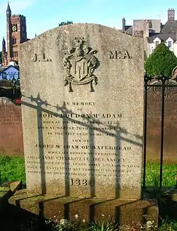 McAdam died in Moffat, Dumfriesshire, while returning to his home in Hoddesdon, Hertfordshire, from his annual summer visit to Scotland. His three sons, and in turn four grandsons, followed him into the profession and assisted with the management of turnpike trusts around the country. His second surviving son, James Nicoll McAdam, the "Colossus of Roads", was knighted for managing turnpike trusts: a knighthood, it is said, previously offered to his father but declined.[2]