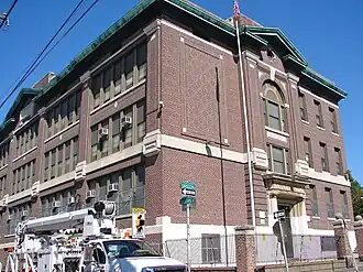Designed by Henry deCourcy Richards, this historic structure was built between 1909 and 1910, and is a three-story, five-bay by three-bay, brick building that sits on a raised basement. Designed in the Colonial Revival style, it has a three-story, rear brick addition that was built in 1922. It features a pedimented cornice, brick parapet, projecting central section, and a two-story arched opening above the main entrance.[2] The school was named for Chief Justice John Marshall.