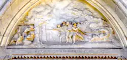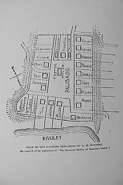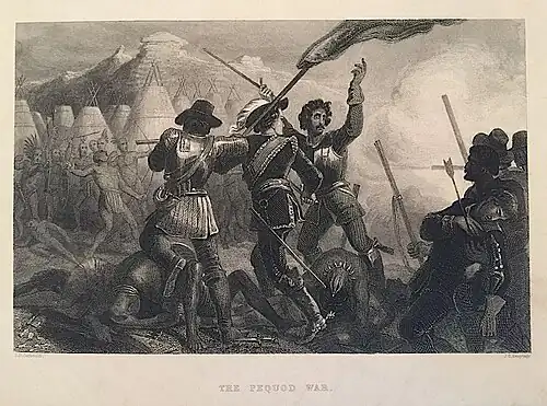 The main battle of the Pequot War started in the predawn hours of May 26, 1637, when Colonial forces led by Captains John Mason and lieutenant Robert Seeley, along with their Indian allies, attacked one of two main fortified Pequot villages at Mystic. Only 20 soldiers breached the palisade's gate and were quickly overwhelmed, to the point that they utilized fire to create chaos and facilitate their escape from within. Sergeant William Hayden of Windsor is credited with saving the life of Captain Mason inside the fort, using his sword to cut through the bow-string of one of the Pequot warriors aiming his weapon at Mason.[6] The ensuing conflagration trapped the majority of the Pequots and caused their death; those who managed to exit were slain by the sword or musket from the others who surrounded the fort. Only a handful of approximately 500 men, women, and children survived what became known as the Battle of Mistick Fort.