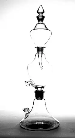 In December 1774, Nooth's paper entitled "The description of an apparatus for impregnating water with fixed air" was read at the Royal Society. The paper described an instrument used to produce carbonated water (carbon dioxide, at the time, was referred to as "fixed air"). The apparatus consisted essentially of three stacked glass vessels. Carbon dioxide was generated in the bottom vessel by the action of diluted sulfuric acid on pieces of chalk or marble. It diffused through a valve into the middle vessel, which contained the liquid to be carbonated. Liquid displaced by the gas collected in the topmost vessel.[4][5]