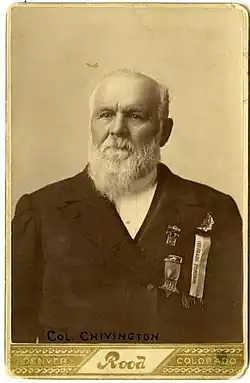 In May 1860, Chivington moved, with his family, to the Colorado Territory and settled in Denver. From there, he sought to establish missions in the South Park mining camps in Park County.[9] He was elected Presiding Elder of the new Rocky Mountain District and served in that capacity until 1862. Controversy began to mar Chivington's appointment, who stopped performing his function as presiding elder. Chivington was not reappointed at the 1862 conference; rather, his name was recorded as "located." According to early Methodist polity, describing a minister as "located" means that the minister has effectively been retired. Historian of Methodism Isaac Beardsley, a personal friend of Chivington, suggested that Chivington was "thrown out" because of his involvement with the armed forces.[6] Chivington's status as being "located" did not remove him completely from Methodist politics. His name appears as a member of the executive board of Colorado Seminary, the historic precursor of the University of Denver and the Iliff School of Theology. His name also appears in the incorporation document issued by the Council and House of Representatives of the Colorado Territory, which was approved by then governor John Evans.[6]