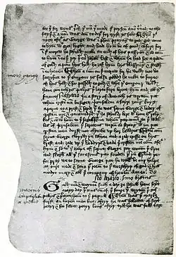 The Liber Festivalis (Book of Festivals) or Festial is a collection of homilies for the festivals of the liturgical year as it was celebrated in Mirk's time in Shropshire. He began with Advent Sunday and worked his way through to All Saints' Day, with a final sermon for the consecration of a church, although the order is disturbed to some extent in some manuscripts. Each sermon features one or more narrations, intended to illustrate the theme. His most important source was the Golden Legend,[1] an immensely popular collection of hagiographies compiled by Jacobus de Voragine in the mid-13th century. However, Mirk chose to write in the vernacular, Middle English, a decision of ambiguous significance. It distinguished him from most other apologists for orthodoxy, as use of the vernacular was a key demand of the Lollards, although it was still not considered heretical in itself.[17] Mirk was faced by the rise of a new class of literate laypeople,[18] as well as by the sometimes unlettered parish clergy[1] whom he acknowledges as his audience. His response was to present a compressed but comprehensive view of Christian teaching that privileges oral tradition above Biblical texts.[17]