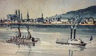 Molson toyed with the idea of buying a steamship after seeing Robert Fulton's Clermont go down the Hudson.. However, there was also another steamship commissioned by a group of businessmen from Burlington, Vermont, in 1808 to be built by two brothers in Burlington, Vermont, named John and James Winans. This ship was quite unsurprisingly called the Vermont and went into service in 1809. The Vermont ran in modern Canada, along Lake Champlain and the Riviere Richelieu to Dorchester (modern day Saint-Jean-sur-Richelieu in Quebec).[13] Molson's steamship would be the first in Canada. Molson teamed up with John Jackson and John Bruce who would build a ship for Molson in return for putting up the money and part ownership. Built in Montreal (with engines produced at Forges du Saint-Maurice in Trois-Rivières) in 1809, Accommodation became the first steamship to ride on the waters of the Saint Lawrence River.[1] This was a great feat for Molson but, from a business viewpoint, it was a net loss, costing £4000 by 1810.[14] Molson was determined to make money on his ships so he dismantled Accommodation and purchased in person two steamship engines from Boulton & Watt in Birmingham, England. He combined the two engines and the remains of Accommodation to create Swiftsure, a magnificent ship that was a vision of elegance and speed, traversing the route at an average of seven miles an hour. Swiftsure measured 130 feet on the keel and had a beam of 24 feet.[15] The steamship provided a ready cash business, while the government in London had suspended the transfer of specie from 1800 to 1817. Most other Canadian business was carried on with London bills of exchange, and the transfer of those bills from Montreal to Quebec earned the Molsons up to 20 per cent.[16][17] And since brewing occupied the months when the steamboats were laid up, a harmonious concordance of activities resulted.[18]