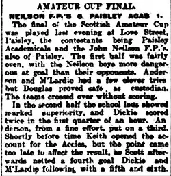 The club had ample consolation by winning the first Scottish Amateur Cup in 1909–10, beating fellow Paisley old boy side Paisley Academicals 6–1 at Love Street in the final, all of the goals coming in the second half.[3]