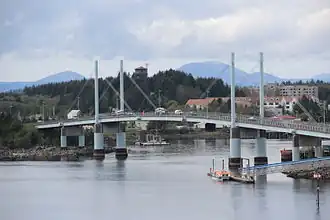 The John O'Connell Bridge is a cable-stayed bridge over the Sitka Channel located in Sitka, Alaska. The bridge connects the town of Sitka on Baranof Island to the airport and Coast Guard Station on Japonski Island. Until the bridge was completed in 1971, the commute was only achievable through a ferry service. The bridge is named after John W. O'Connell, a former mayor of Sitka.[2] The two-lane bridge is 1,255 feet (383 m) in total length, with a main span of 450 feet (140 m).[3] The bridge was also the United States' first vehicular cable-stayed girder spanned bridge.[4] The four 100-foot-high (30 m) steel pylons carry two three-cable sets, each carrying a section of the bridge deck.[5][6] Special consideration was given to the bridge's aesthetics due to its proximity to nearby Castle Hill.[2]