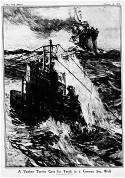After he moved to the east coast, he began to have success branching out into other areas of illustration. The work that he is remembered for today is a painting he did for the Red Cross during World War I in May 1918. It featured the picture of a medic caring for a wounded soldier, signaling for help. He did a second cover for the Red Cross in August 1918, a soldier carrying a wounded military service dog. His other works were of marine themes, of military ships at sea, struggling with the elements and fighting. Though he moved into magazines, he continued to make a living from news illustrations, including the Bridgeport Standard in the Connecticut town where he lived,[6][7] and the New York Tribune.
