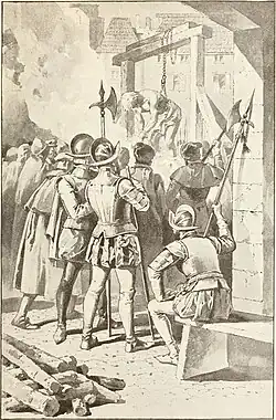 On 14 December he was formally condemned, on the record of his previous conviction, and that same day was hanged in St Giles's Fields, and burnt "gallows and all".[7] It is not clear whether he was burnt alive for heresy or whether he was hanged, drawn, and quartered for high treason first.[13]