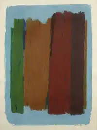 A sizable group of acrylic studies on paper is closest to his best known work, characterized primarily by vertical units that can best be described as hovering somewhere between broad, mottled paint strokes and specific shapes. The studies gain their sense of dynamics from the nudging and jostling of neighboring color units that push at indefinite boundaries. More action comes from the interplay of tones and the resulting perceptual vibrations, and still more from occasional suggestions of shifting planes.