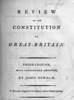 In 1792, Oswald published an expanded French edition of his 1784 pamphlet, Review of the Constitution of Great Britain. The work reflected radical political views that aligned with prevailing revolutionary sentiment in France at the time. Its reception facilitated his admission to the Jacobin Club, where he became a prominent figure among the English-speaking supporters of the French Revolution.[5]
