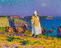 Russell married the renowned beauty Marianna Antonietta Mattiocco, an Italian seamstress and model of Auguste Rodin's.[2][12] They settled at Belle Île off the coast of Brittany, where he designed his own home and established an artists' colony.[6] Russell was the first non-native to move to the island, leading locals to call his home overlooking Port Goulphar "Le Chateau de l'Anglais".[1][12] He would have 11 children with Mattiocco, of whom six, five sons and a daughter, survived.[2][13]