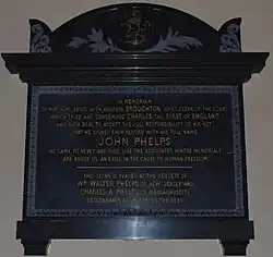 In Mermoriam Of Him who being with Andrew Broughton joint clerk of the Court which tried and condemned Charles the First of England, had such zeal to accept the full responsibility of his act, that he signed each record with his full name John Phelps. He came to Vevey, and died like the associates whose memorials are about us, an exile in the cause of human freedom. This slab is placed at the request of William Walter Phelps of New Jersey, and Charles A. Phelps of Massachusetts, descendants from across the seas.