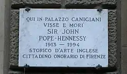 Hence, he retired at the age of seventy-five and moved permanently to Florence with his lover, Michael Mallon,[9] and resided at Palazzo Canigiani, where he died five years later.[10] Pope-Hennessy is buried in the Cimitero degli Allori in Florence. His gravestone includes a quote from the First Epistle to the Corinthians in the Bible. The remains of his impressive art collection in Florence were sold two years after his death for roughly GBP1,000,000 at Christie's in New York.[11]