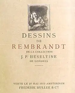 "Heseltine was a keen collector of oil paintings, drawings and watercolours of the English and Continental schools. Among the old master drawings were specimens by Rembrandt, Rubens, Raphael, Michelangelo, Fra Bartolomeo, Holbein, Dürer, Constable, Watteau and Boucher."[1] In 1912, after fifty years of collecting, he sold his collection of over 600 old master drawings to the London dealer Colnaghi & Obach for a price near $1,000,000.[9] Thirty-two of his Rembrandt drawings sold the following May at what was then a high average of over $3,750 per drawing.[10] In his collection, Heseltine also amassed a substantial collection of etchings by the Norwich School of painters.[11]