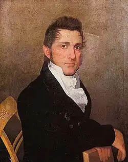 Cooke became the highest vote-getter of the 14 candidates for the four seats from the district encompassing Frederick and Jefferson Counties in that convention. At the convention, he became one of the leading spokesmen for reform, along with Philip Doddridge. Whereas Doddridge advocated apportioning both the state house and senate based upon the white population, Cooke accepted a compromise that apportioned the state senate using the old formula, as well as slightly increased suffrage by reducing but not eliminating the property qualification for voters. Cooke was one of the seven members who drafted the new state constitution and was the only one of the reformers from the Shenandoah Valley and trans-Allegheny region to vote for the new document. Accused of having deserted westerners' interests, Cooke defended himself by writing letters to the editors of various Virginia newspapers. He argued that the Shenandoah Valley had fewer shared political interests with the trans-Allegheny region than with the western Piedmont counties where he had grown up. Jefferson County voters apparently agreed, overwhelmingly approving the new constitution in a spring referendum (243 to 53), while Frederick County voters approved it by the narrow margin of 451 to 438.[1] In 1835, Cooke ran as the candidate of the new Whig party, but narrowly lost an election to the U.S. House of Representatives from Virginia's 15th congressional district (that no longer exists, but then comprised trans-Allegheny counties) by a vote of 1849 to 1971, even though he narrowly beat the incumbent Edward Lucas in Jefferson County by a 372 to 365 margin.[7] Cooke also fell deeply into debt, in part because of debts owed by his father's estate, as well as his own generosity and the Panic of 1837. His investments in a coal mine as well as Texas land failed.[1] During his political career, Cooke owned enslaved labor. In the 1820 census, he may have owned seven slaves.[8] When he attended the 1829 constitutional convention, Cooke owned six taxable slaves.[1][9] In the 1840 census, reflecting Cooke's financial troubles mentioned below, his household owned three slaves, a man between 10 and 24 years old and two women between 35 and 55 years old.[10]