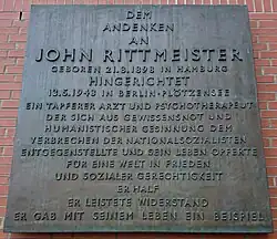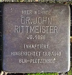 John Friedrich Karl Rittmeister (21 August 1898–13 May 1943), often also abbreviated John F. Rittmeister, was a German neurologist, psychoanalyst and resistance fighter against Nazism.[1] Rittmeister was a humanist and socialist who based his opposition to the Nazi state on moral grounds.[2] He was known as a communist member of the anti-fascist resistance group that was later called the Red Orchestra by the Abwehr.