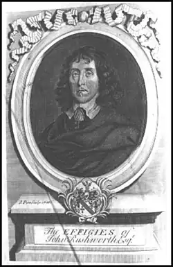 John Rushworth (c. 1612 โ 12 May 1690) was an English lawyer, historian and politician who sat in the House of Commons at various times between 1657 and 1685. He compiled a series of works covering the English Civil Wars throughout the 17th century called Historical Collections and also known as the Rushworth Papers.