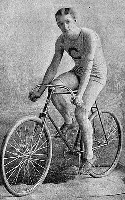 Johnson was the first to bicycle 1-mile in less than two minutes, or 1:56.6. This happened in 1892 at a racing track in Independence, Iowa.[2] Besides racing on the track, early in his career he also competed in road races.[3] Johnson was also a world record holder in speed skating, and won world championship titles in both sports. Later in his career, Johnson rode for racing teams sponsored by the bicycle manufacturers E.C. Stearns Bicycle Agency of Syracuse, N.Y., and Schwinn Bicycle Co. of Chicago. He retired from competitive cycling in 1900. He died January 17, 1934, in Minneapolis, Minnesota.[4]